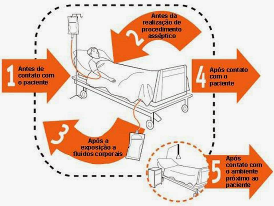 A higienização das mãos é um procedimento essencial neste controle. O nosso processo é baseado nas recomendações da OMS, que considera a necessidade de higienização das mãos, por todos os profissionais de saúde, em cinco momentos diferentes, incluindo antes e depois de qualquer contato com o paciente, conforme mostra a figura abaixo.